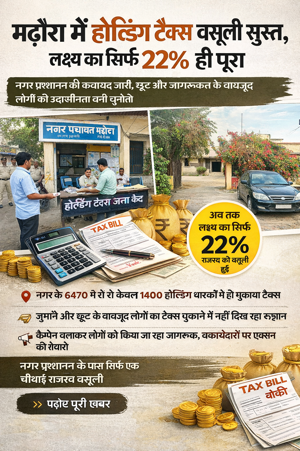 मढ़ौरा में होल्डिंग टैक्स वसूली सुस्त, लक्ष्य का सिर्फ 22% ही पूरा March 18, 2026 No Comments Read More »