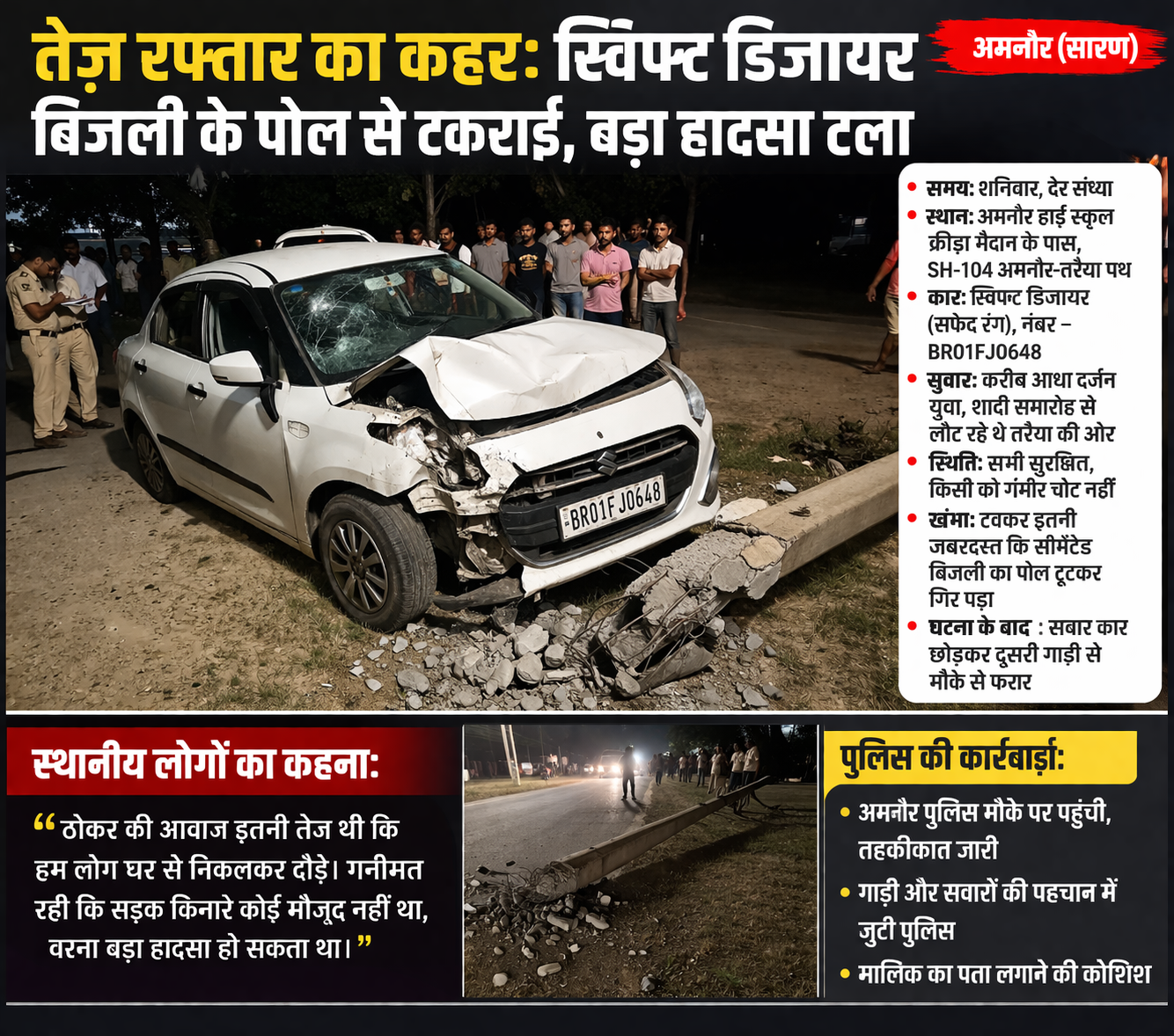 तेज रफ्तार का कहर: स्विफ्ट डिजायर बिजली के पोल से टकराई, बड़ा हादसा टला April 3, 2026 No Comments Read More »