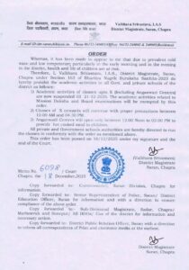 News4Bihar | सारण जिले में लगातार जारी शीतलहर को देखते हुए जिला दंडाधिकारी, सारण द्वारा एहतियातन बड़ा निर्णय लिया गया है। जारी आदेश के अनुसार जिले के सभी विद्यालयों में (आंगनबाड़ी केंद्रों सहित) कक्षा 10वीं तक की पठन-पाठन गतिविधियों पर दिनांक 21 दिसंबर 2025 तक पूर्ण प्रतिबंध लगाया गया है।