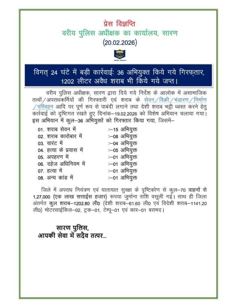 News4Bihar | सारण | वरिष्ठ पुलिस अधीक्षक कार्यालय, सारण द्वारा जारी प्रेस विज्ञप्ति के अनुसार जिले में बीते 24 घंटे के अंदर व्यापक अभियान चलाकर 36 अभियुक्तों को गिरफ्तार किया गया है। इस दौरान कुल 1202 लीटर अवैध शराब भी जब्त की गई है।