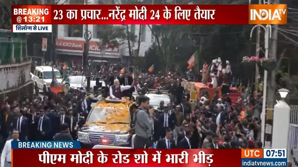 PM Modi: प्रधानमंत्री नरेंद्र मोदी मेघालय की राजधानी शिलांग पहुंचे गए हैं। यहा रोड शो चल रहा है। इसमें वे यहां बड़ी संख्या में उन्हें देखने को आतुर प्रशंसकों का अभिवादन कर रहे हैं। प्रधानमंत्री नरेंद्र मोदी इससे पहले नागालैंड में थे, जहां उन्होंने चुनावी सभा को संबोधित किया। इसके बाद वे मेघालय की राजधानी शिलांग पहुंच गए हैं। यहां बड़ी संख्या में लोगों का वे रोड शो में अभिवादन कर रहे हैं। दरअसल, इन दोनों राज्यों में 27 फरवरी को विधानसभा चुनाव के लिए मतदान होगा। पीएम मोदी घालय के शिलॉन्ग में रोड शो कर रहे हैें। इससे पहले नागालैंड के चुमौकेदिमा जिले में पीएम मोदी भाजपा-नेशनलिस्ट डेमोक्रेटिक प्रोग्रेसिव पार्टी (एनडीपीपी) की एक रैली को संबोधित किया। इन दोनों राज्यों में 25 फरवरी को चुनाव प्रचार खत्म हो जाएगा। इससे ठीक एक दिन पहले पीएम मोदी का मेघालय-नागालैंड यह दौरा बीजेपी और उसके गठबंधन के लिए बेहद अहम माना जा रहा है।